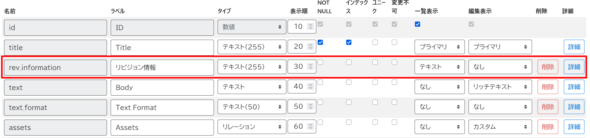 一覧にカラムを追加するために、モデルに対して「リビジョン情報」カラムを作成します。